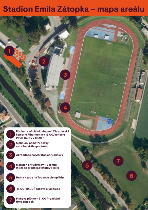 V 15 h • oficiální zahájení, Chrudimská komorní filharmonie, odhalení pamětní desky a sochařského portrétu, přejmenování Letního stadionu na Stadion Emila Zátopka