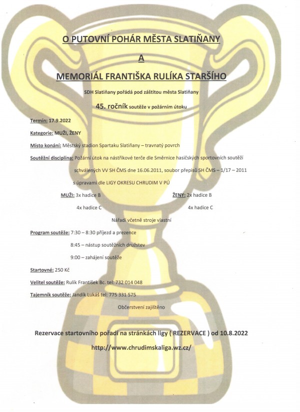 SDH Slatiňany pořádá pod záštitou města 45. ročník soutěže v požáním útoku " O putovní pohár města a memoriál Fr. Rulíka staršího".