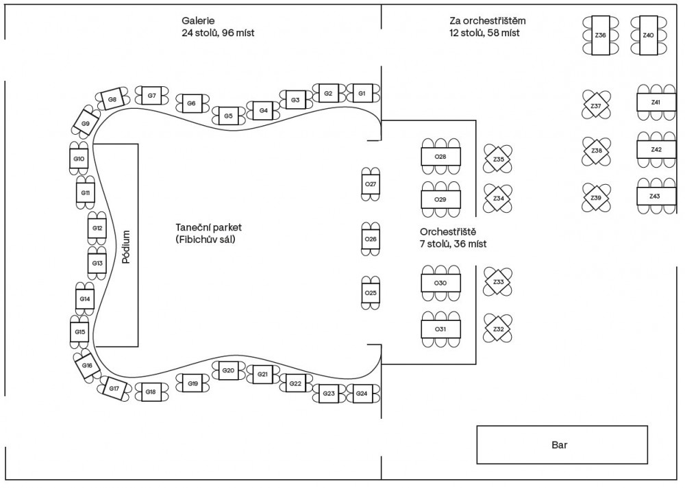 - nahoře na balkoně / galerii bude od začátku plesu „stolová úprava“ (na galerii nebudou tradiční místa, jak je nyní obvyklé, ale budou zde stoly s židlemi)