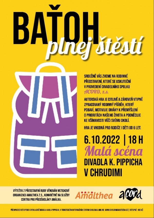 Divadelní spolek Acord, z.s. Vás srdečně zve na rodinné divadelní představení. Autorská hra je citlivě a zároveň vtipně zpracovaný rodinný příběh, který pobaví, motivuje k přemýšlení o prioritách našeho života a podněcuje ke všímavosti vůči svému okolí. Hra je vhodná pro rodiče i děti od 6 let.