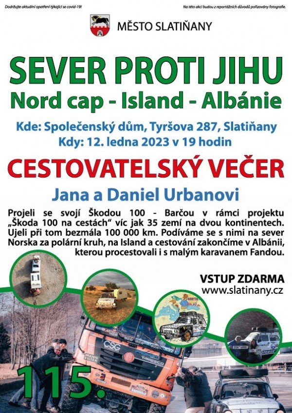 Město Slatiňany srdečně zve, na 115. cestovatelský večer Sever proti jihu - Nord cap - Island - Albánie s cesovatateli Janou a Danielem Urbanovými.