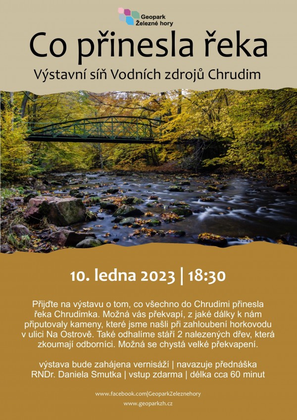 Přijďte na výstavu o tom, co všechno do Chrudimi přinesla řeka Chrudimka. Možná vás překvapí, z jaké dálky k nám připutovaly kameny, které jsme našli při zahloubení horkovodu v ulici Na Ostrově. Také odhalíme stáří 2 nalezených dřev, která zkoumají odborníci. Možná se chystá velké překvapení.