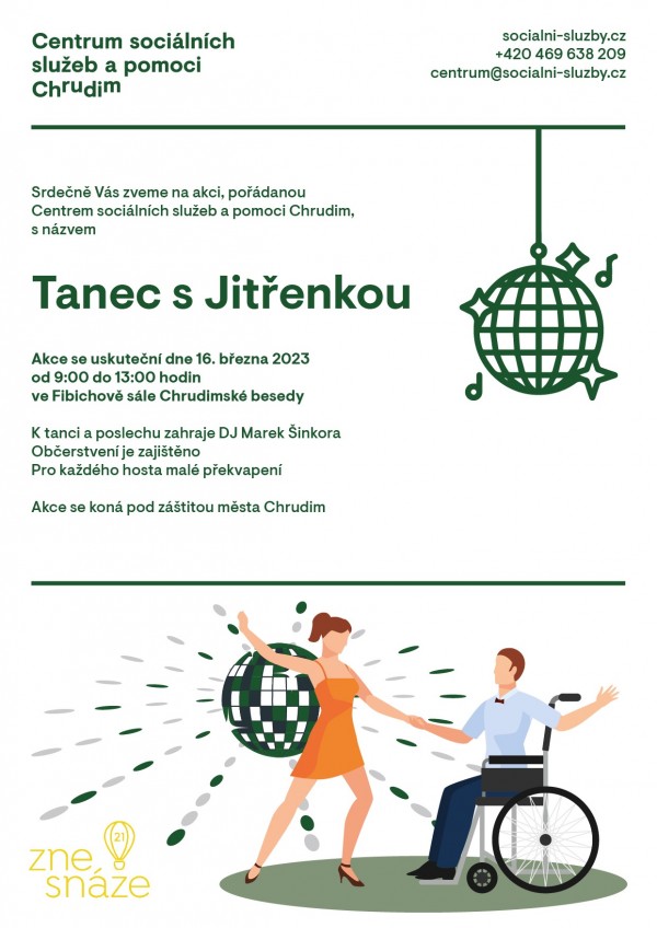 Ve čtvrtek 16. března od 9 hodin protančíme doslova celé dopoledne na akci nazvané Tanec s Jitřenkou! Jedná se o taneční setkání hendikepovaných dětí, mládeže i dospělých v krásných prostorách Fibichova sálu v Muzeu Chrudim (Široká ul. čp. 85), které pořádá Centrum sociálních služeb a pomoci Chrudim, příspěvková organizace města. Akce potrvá do 13 hodin.