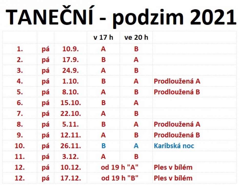 - kurzy budou začínat v pátek 10. září 2021 a poté se budou konat v pátečních termínech (vyhrazujeme si právo na výjimku vzhledem ke konání akcí, popř. prázdninám)