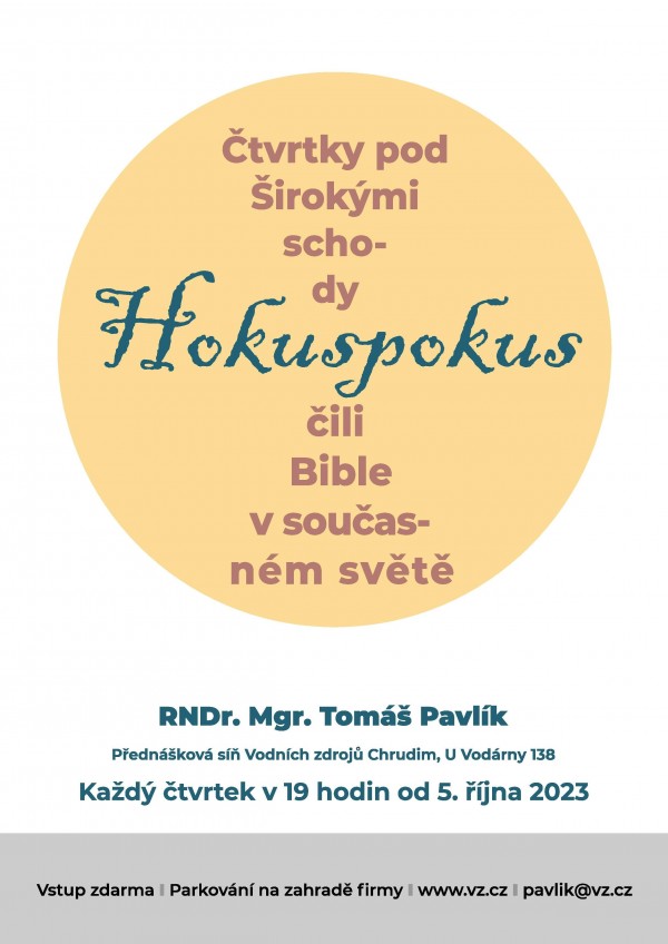 Co může spojovat švédskou vlajku, plzeňské pivo, město s nejlepší zoologickou zahradou na světě, zakladatele populárně vědeckého časopisu Živa, tropický strom baobab, Kostelec u Heřmanova Městce? Dozvíte se to v cyklu přednášek o Bibli ve světě kolem nás, cyklu s poněkud tajemným názvem „Hokuspokus“. Přednášky se budou konat v přednáškové síni firmy Vodní zdroje Chrudim na náměstí U Vodárny čp. 138, pod Širokými schody, a to vždy ve čtvrtek od 19 hodin – poprvé dne 5. října 2023. Vstup je zdarma, parkování je zajištěno na zahradě firmy.