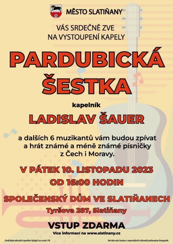 Město Slatiňany Vás srdečně zve na vystoupení kapely Pardubická šestka.
