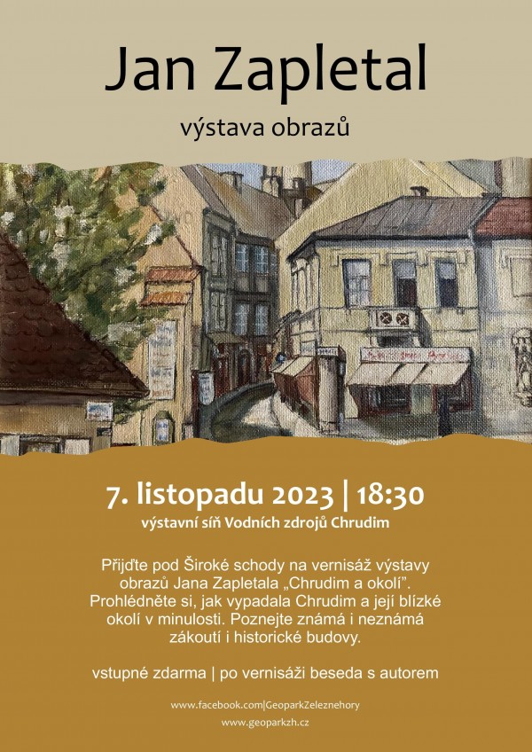 Přijďte pod Široké schody na vernisáž výstavy obrazů Jana Zapletala „Chrudim a okolí”. Prohlédněte si, jak vypadala Chrudim a její blízké okolí v minulosti. Poznejte známá i neznámá zákoutí i historické budovy.