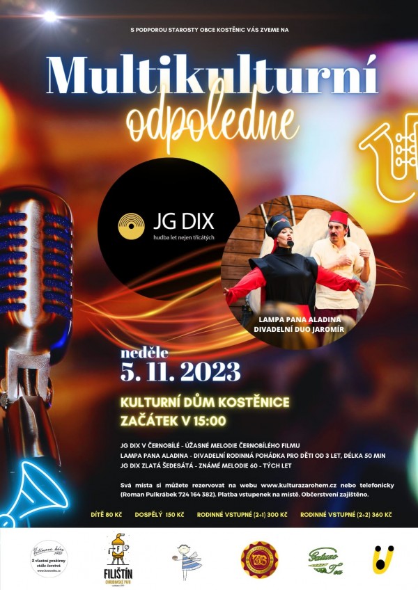 S podporou STAROSTY OBCE KOSTĚNICE pro vás připravujeme MULTI KULTURNÍ ODPOLEDNE V KOSTĚNICÍCH, kde zazní úžasné melodie černobílého filmu v podání hudebního seskupení JG Dix.