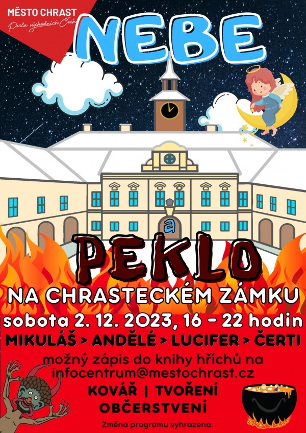Přijďte s dětmi (nebo i sami) podívat se na zámecké peklo a nebeský zámek. Ve sklepě děti může postrašit Lucifer se svou pekelnou rodinkou a v kapli pochválit Mikuláš se svými anděly. Pokud chcete, aby byli Lucifer a Mikuláš dokonale informováni, napište jim hříchy a úspěchy svých ratolestí na e-mail infocentrum@mestochrast.cz.