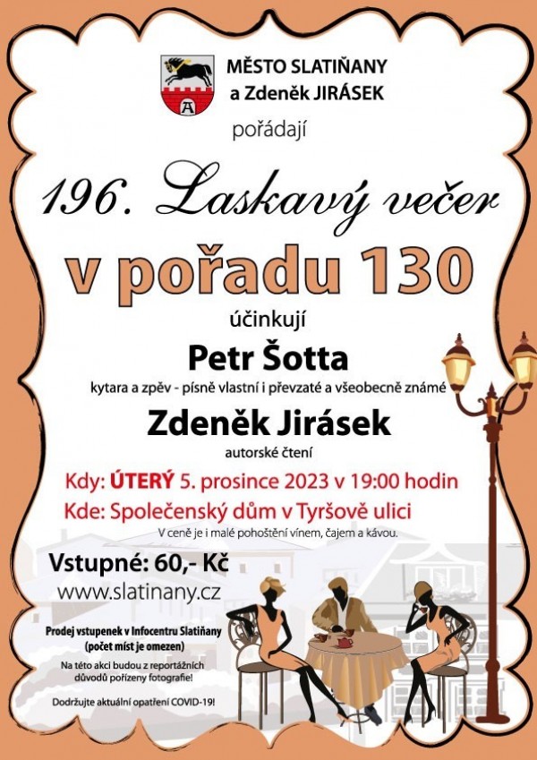 Dovolujeme si vás pozvat na 196. Laskavý večer v pořadu 130. Účinkují Petr Šotta - kytara, zpěv a Zdeněk Jirásek autorské čtení.