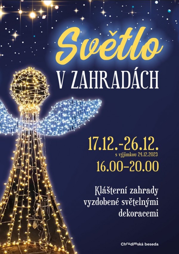 ! Klášterní zahrady Chrudim budou od 17.12. do 26.12. otevřeny pro veřejnost pouze v čase od 16 do 20 h. Pro veřejnost budou uzavřeny z důvodu bezpečnosti instalovaných objektů. Děkujeme za pochopení.