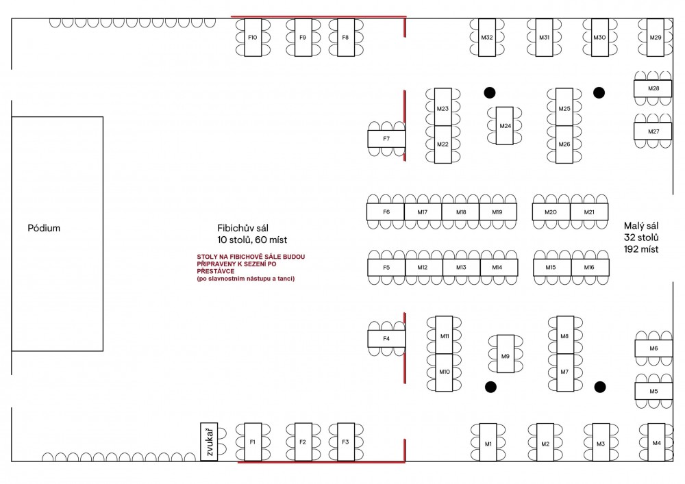 • při plesu – po ukončení nástupu a následné přestávce budou připravena místa k sezení na Fibichově sále