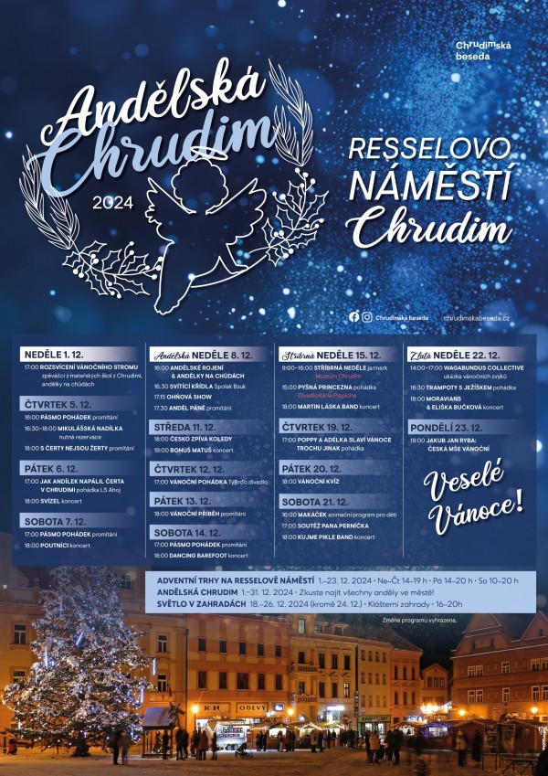 Vánoce patří k nejkrásnějším obdobím v roce. Přijďte si vychutnat vánoční atmosféru na Resselově náměstí, kde se uskuteční ADVENTNÍ TRHY. Pestrý sortiment, čokoláda, svařák i punč. Přijďte se podívat, nakoupit dárky nebo jen si popovídat s kamarády. Adventní trhy se uskuteční od 1. do 23. prosince 2024 s otevírací dobou Ne–Čt 14–19, Pá 14–20, So 10–20 h.