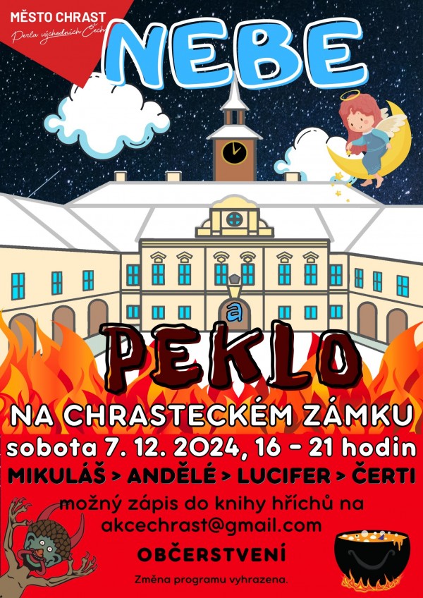 Přijďte s dětmi (nebo i sami) podívat se na zámecké peklo a nebeský zámek. Ve sklepě děti může postrašit Lucifer se svou pekelnou rodinkou a v kapli pochválit Mikuláš se svými anděly. Pokud chcete, aby byli Lucifer a Mikuláš dokonale informováni, napište jim hříchy a úspěchy svých ratolestí na e-mail akcechrast@gmail.com. Oba vládcové prosí, pište do pátku 6. 12. 2024 do 15 hodin, aby váš dopis mohl být zpracován.