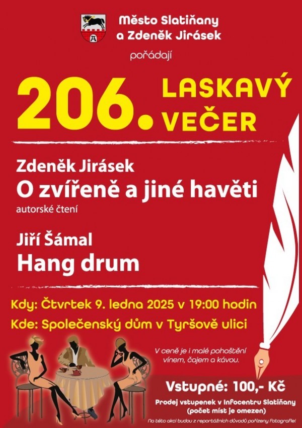 Srdečně zveme na 206. Laskavý večer, kdy si budete moci poslechout autorské čtení Zdeňka Jiráska z jeho nové básnické sbírky O zvířeně a jiné havěti. Na hudební nástroj ho doprovodí Jiří Šámal na hang drum.