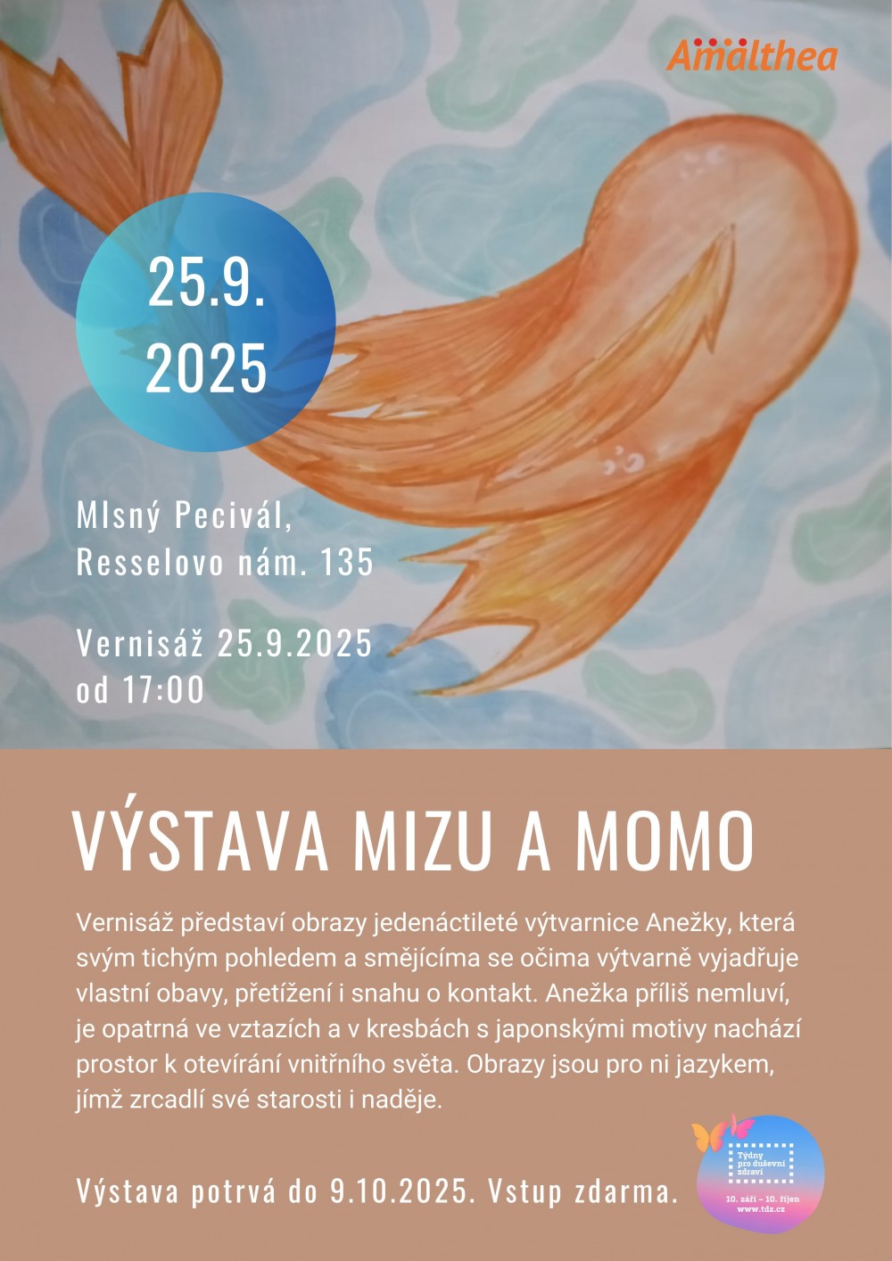 V rámci týdnů pro duševní zdraví Vás srdečně zveme na vernisáž výtvarných prací 11leté Anežky do prostor kavárny a obchodu Mlsný Pecivál. Výstava potrvá až do 9.10.