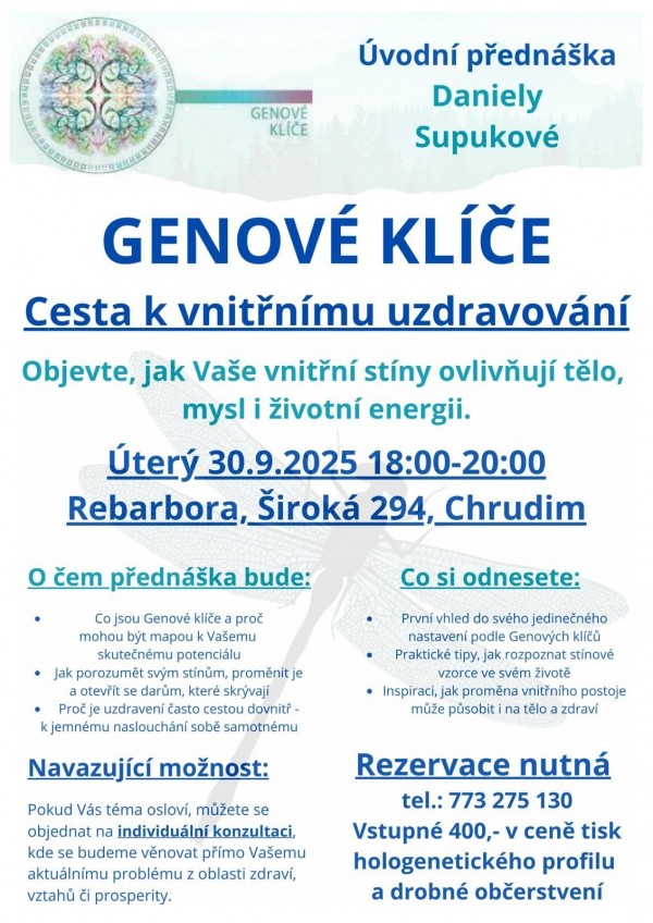 Společně s lektorkou Danielou Supukovou se ponoříme do témat, která nám pomohou pochopit, co jsou Genové klíče a jak nám mohou pomoci na cestě transformace, rozpoznat vlastní stíny a proměnit je v dary, otevřít se procesu uzdravování skrze sebepoznání a přijetí.