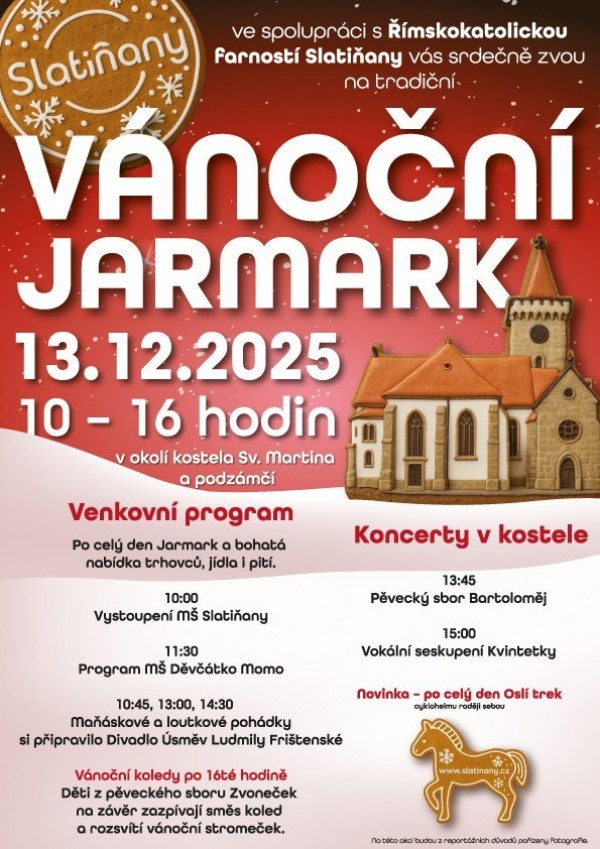 Srdečně zveme a již tradiční Vánoční jarmark. Čekají vás bohaté trhy a vystoupení dětí ze MŠ a ZÚŠ a také koncerty v kostele sv. Martina.