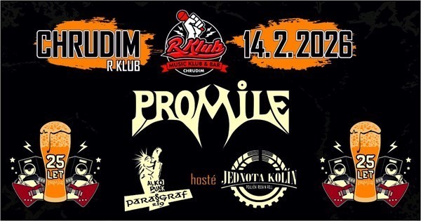 Výroční mejdan skupiny PROMILE na svátek zamilovaných? Ideální spojení. PROMILE slaví čtvrt století a jak jinak než ve velkém stylu. Připraven je vypečený koncert s nejedním hostem a ve společnosti spřátelených spolků PARAGRAF 219 a JEDNOTA KOLÍN. No a možná bude i něco víc