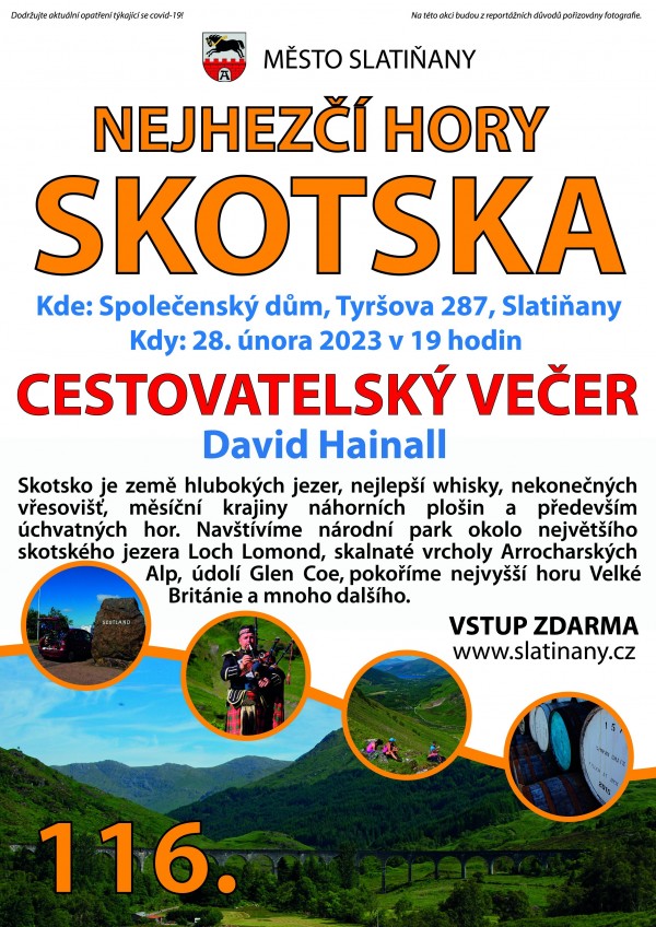 Město Slatiňany srdečně zve na 116. Cestovatelský večer s názvem " Nejhezčí hory Skotska". Přednášejícím bude pan David Hainall.