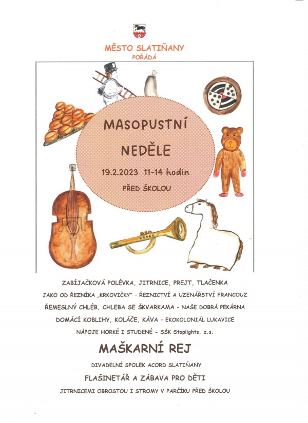 Město Slatiňany pořádá "Masopustní neděli". Můžete se těšit na Masopustní rej, flašinetáře, zabíjačkové dobroty, koblihy, koláče a mnoho dalšího.