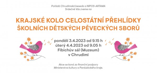 Chrudimská beseda & Národní informační a poradenské středisko pro kulturu – Artama Vás zvou na krajské kolo celostátní přehlídky školních dětských pěveckých sborů. Akce se koná za finanční podpory Ministerstva kultury a Pardubického kraje.