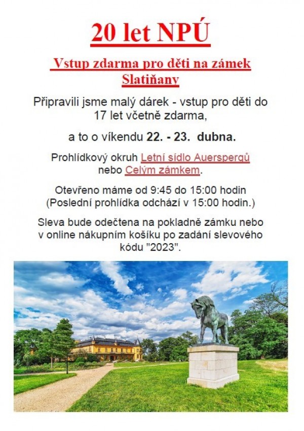 NPÚ slaví 20 let a připravil pro děti do 17 let malý dárek. Vstup na zámek Slatiňany zdarma.