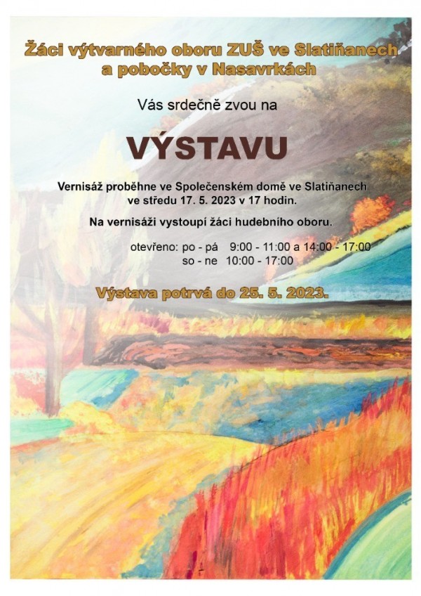 Žáci výtvarného oboru ZÚŠ ve Slatiňanech a pobočky v Nasavrkách Vás srdečně zvou na Výstavu.