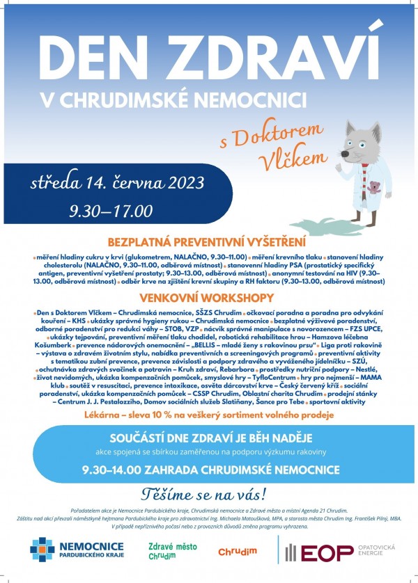 Zahrada Chrudimské nemocnice ožije ve středu 14. června od 9.30 do 17 hodin ve znamení zdraví a zdravého životního stylu. Některé z aktivit najdete i ve vnitřních prostorách nemocnice (budova bývalého očkovacího centra).