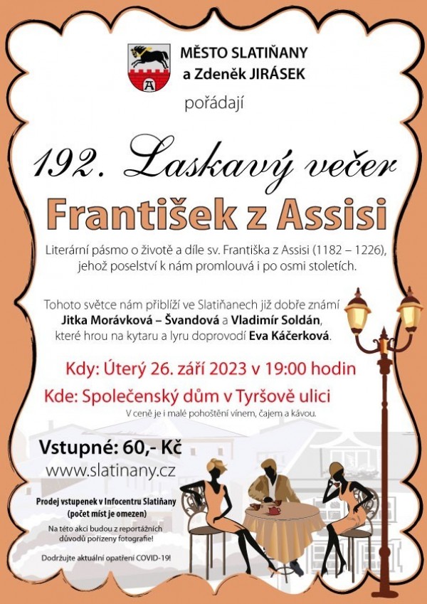 Srdečně zveme na 192. Laskavý večer s názvem František z Assisi - literární pásmo o jeho životě a díle. Účinkuji Jitka Morávková - Švandová, Vladimír Soldán a hudební doprovod Eva Káčerková.