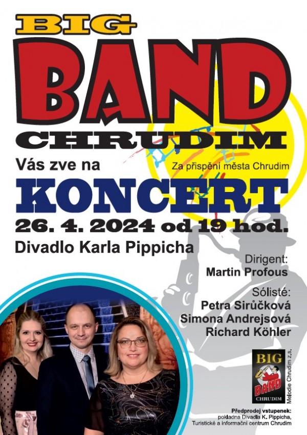 Pořadatel Big Band Chrudim zve všechny příznivce na tradiční koncert. Tentokrát bude program ve vlastní režii. Petra Sirůčková, Simona Andrejsová, Richard Köhler budou zpívat a dirigovat Martin Profous.