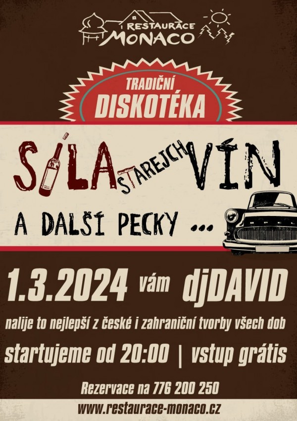 Srdečně zveme na Tradiční diskotéku "Síla starejch vín a další pecky ..." Zahraje DJ David a vstup je zdarma.
