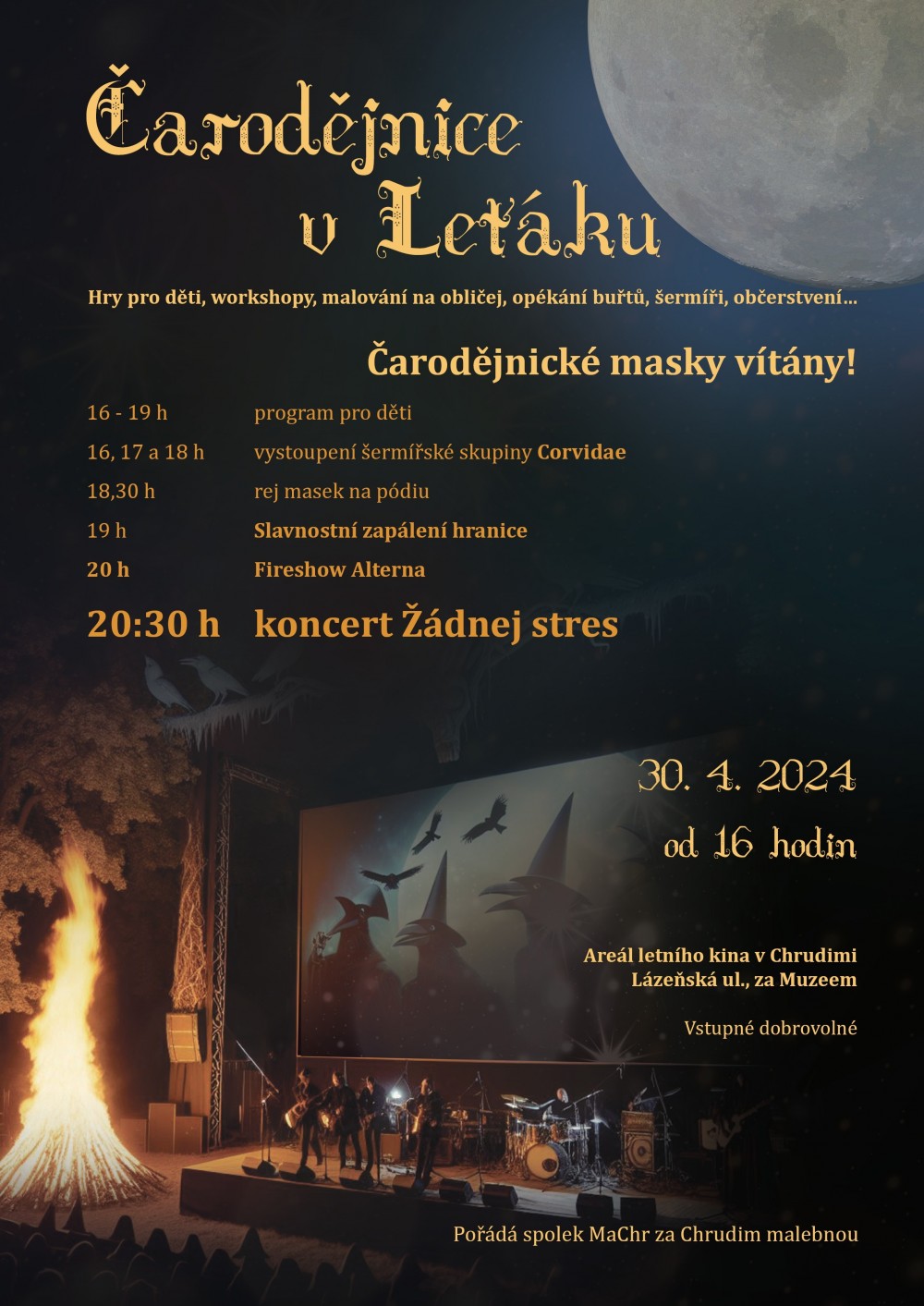 Již tradiční pálení čarodějnic v areálu letního kina. Program pro děti je připravený od 16 do 19 hodin - čarodějné úkoly, workshopy, malování na obličej. Poté bude zapálena velká hranice s čarodějnicí. Ve 20 hodin proběhne ohňová Alterna show. Po představení zahraje kapela Žádnej stres.