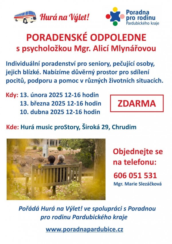 od 12.00 do 16.00 Poradenské odpoledne s psycholožkou Mgr. Alicí Mlynářovou.