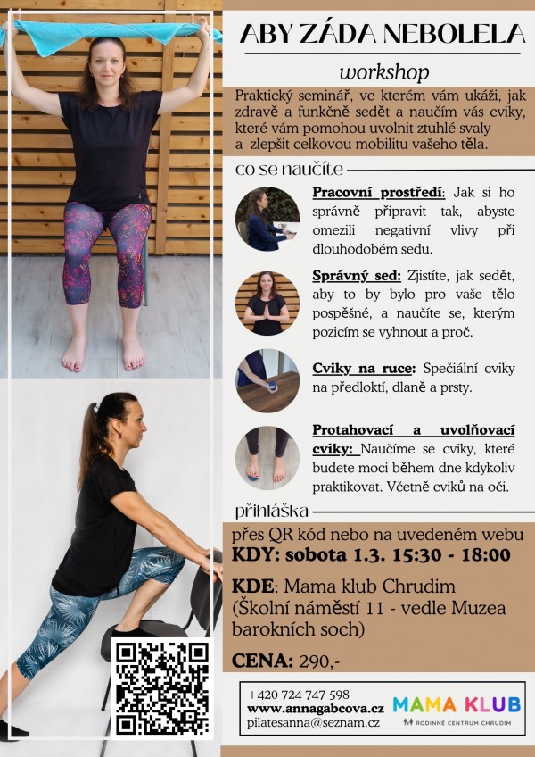 Praktický seminář, ve kterém vám lektorka ukáže, jak zdravě a funkčně sedět. Naučíte se cviky, které vám pomohou uvolnit ztuhlé svaly a zlepšit celkovou mobilitu vašeho těla.