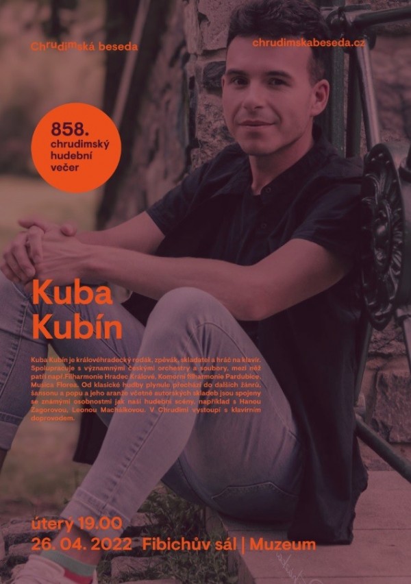 • Kuba Kubín je Královéhradecký rodák, zpěvák, skladatel a hráč na klavír. Spolupracuje s významnými českými orchestry a soubory, mezi něž patří např. Filharmonie Hradec Králové, Komorní filharmonie Pardubice, Musica Florea. Od klasické hudby plynule přechází do dalších žánrů, šansonu a popu a jeho aranže včetně autorských skladeb jsou spojeny se známými osobnostmi jak naší hudební scény, například s Hanou Zagorovou, Leonou Machálkovou. V Chrudimi vystoupí s klavírním doprovodem.