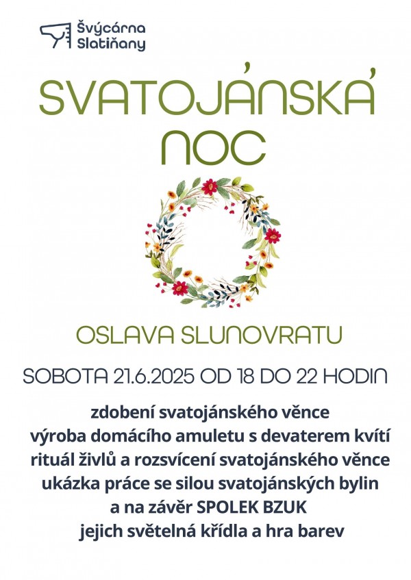 Srdečně zveme na "Svatojánskou noc" - Oslava slunovratu. Přijďte ozdobit a rozsvítit věnec, vyrobte si amulet a na závěr SPOLEK BZUK rozsvítí světelná křídla.