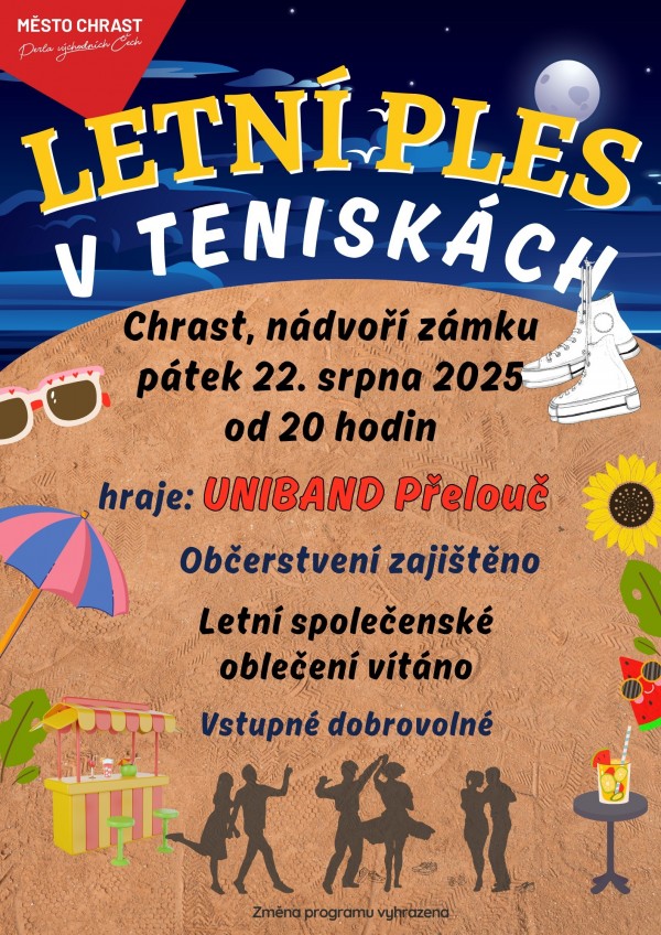 Už jste tančili na nádvoří? V Chrasti můžete. A protože povrch nádvoří není úplně vhodný pro jehlové podpatky, můžete tančit v teniskách. Pořád ale budeme rádi, když si návštěvníci vezmou za své, že se jedná o ples a své oblečení tomu přizpůsobí. K tanci zahraje UNIBAND z Přelouče a těšit se můžete na občerstvení a letní drinky z Restaurace Na Zámku. V pátek 22. srpna od 20 hodin bude nádvoří chrasteckého zámku patřit tanci a zábavě. Vstupné je dobrovolné, tak přijďte podpořit chrastecké dění