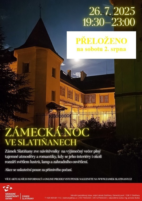 Srdečně zveme na Zámeckou noc do zámku Slatiňany NA NOVÝ TERMÍN 2. SRPNA