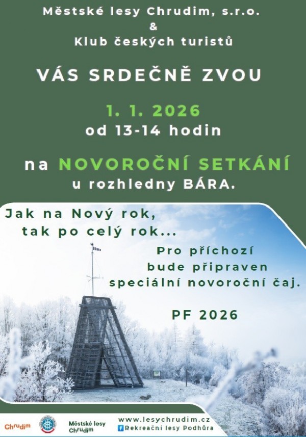Městské lesy Chrudim, s.r.o. společně s Klubem českých turistů Vás srdečně zvou dne 1. ledna 2026 od 13-14 hodin na novoroční čaj u rozhledny Bára.