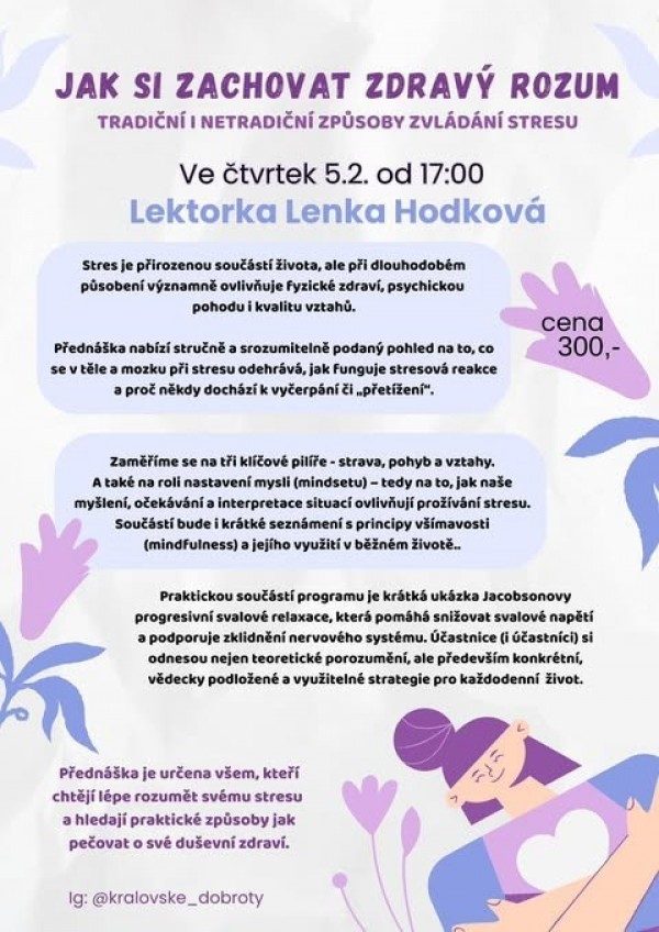 Přednáška je určena široké všem, kteří chtějí lépe rozumět svému stresu a hledají praktické a realistické způsoby, jak pečovat o své duševní zdraví.