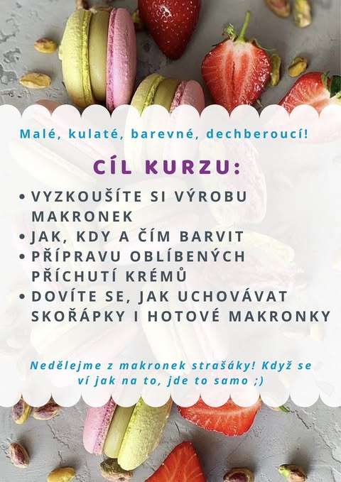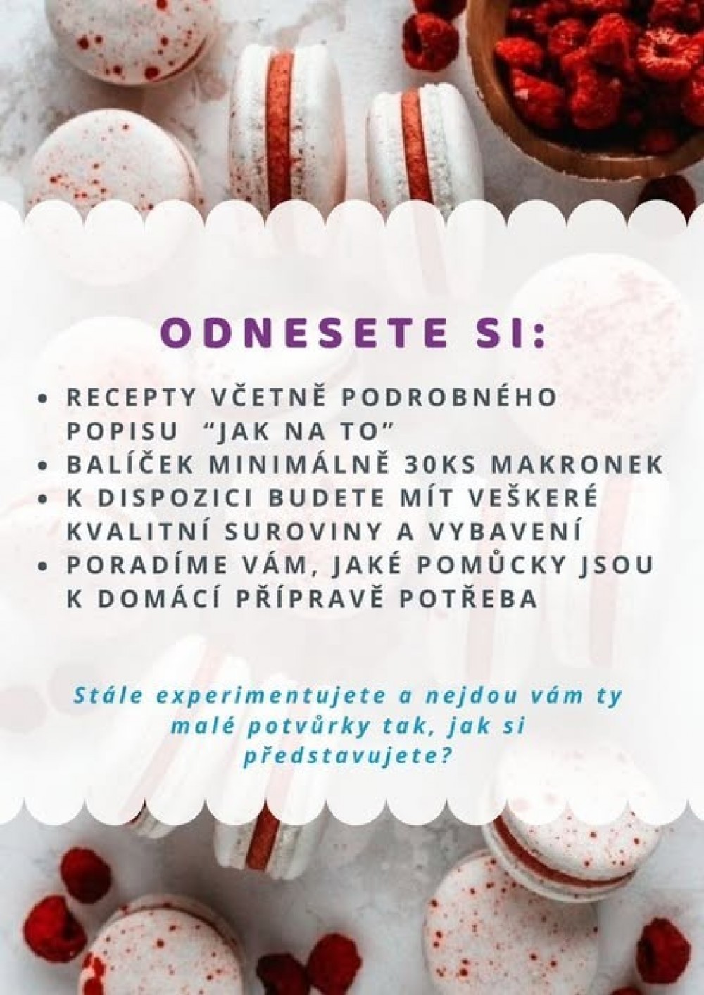 Odměnou pro vás bude občerstvení během kurzu a boxík plný makronek, který si odnesete domů.