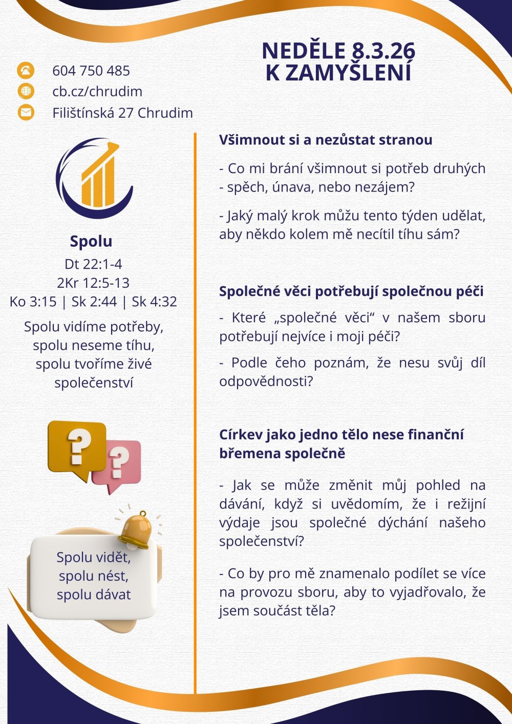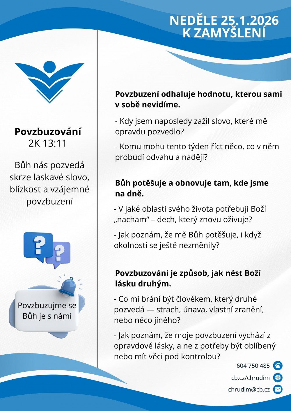 Církev bratrská je společenstvím lidí, kteří vyznávají osobní křesťanskou víru v trojjedinného Boha jako svého Spasitele a Pána. Přijímá Bibli za měřítko víry, učení a života. Hlásí se k základním starokřesťanským vyznáním víry, k dědictví světové i domácí reformace, zvláště pak k odkazu Jednoty bratrské a k zásadám evangelikálního hnutí. Tvoří svazek samostatných sborů, do kterých může kdokoliv přijít a hledat odpovědi na základní životní otázky. Scházíme se každou neděli od 9:30. Kromě hlavních nedělních bohoslužeb máme dále setkání nad Biblí, setkání dětí, dorostu, mládeže a další aktivity.