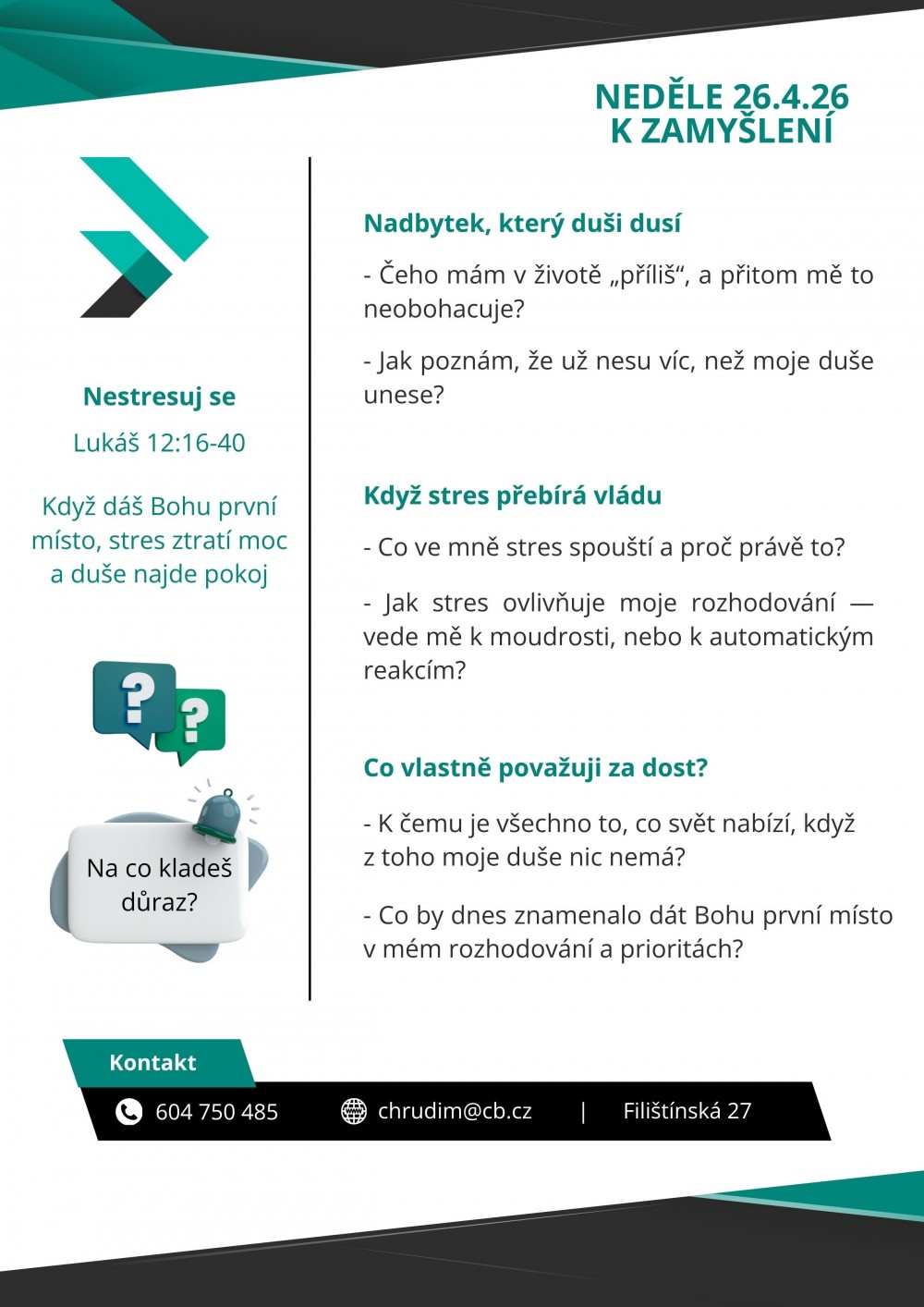 Církev bratrská je společenstvím lidí, kteří vyznávají osobní křesťanskou víru v trojjedinného Boha jako svého Spasitele a Pána. Přijímá Bibli za měřítko víry, učení a života. Hlásí se k základním starokřesťanským vyznáním víry, k dědictví světové i domácí reformace, zvláště pak k odkazu Jednoty bratrské a k zásadám evangelikálního hnutí. Tvoří svazek samostatných sborů, do kterých může kdokoliv přijít a hledat odpovědi na základní životní otázky. Scházíme se každou neděli od 9:30. Kromě hlavních nedělních bohoslužeb máme dále setkání nad Biblí, setkání dětí, dorostu, mládeže a další aktivity.