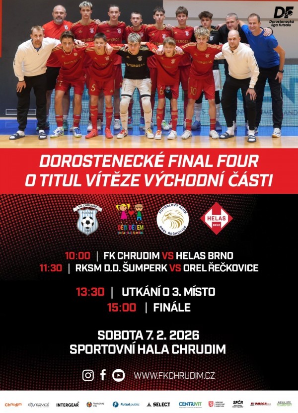 Zveme Vás do Sportovní haly Chrudim na juniorské a dorostenecké Final Four o titul vítěze východní části. Dorostenci odehrají svoje Final Four v sobotu 7.2.2026, junioři o den později, tj. v neděli 8.2.2026 ve Sportovní hale Chrudim (Tyršovo náměstí 12, Chrudim).