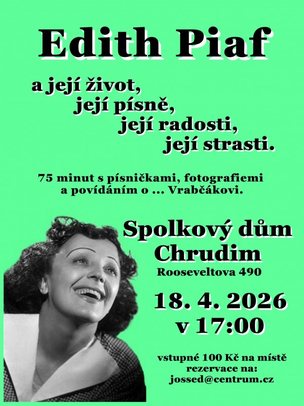 Kulturně-vzdělávací pořad věnovaný nezapomenutelné francouzské šansoniérce Edith Piaf – ženě s mimořádným hlasem a osudem plným vášně, radostí i bolesti. Povídání s písničkami, fotografiemi o ... Vrabčákovi.