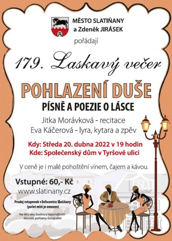 Město Slatiňany a Zdeněk Jirásek Vás sdečně zvou na 179. Laskavý večer píšně a poezie o lásce. Účinkovat bude Jitka Morávková s recitací a Eva Kářerová na lyru, kytaru a zpěv.
