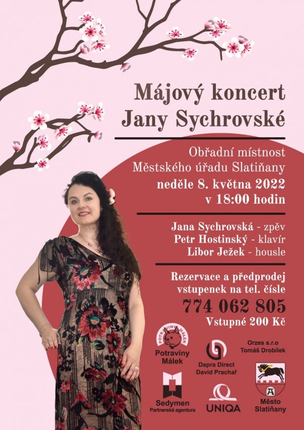 Srdečně zveme na Májový koncert Jany Sychrovské zpěv. Hosté Petr Hostinský hra na klavír a Libor Ježek housle.