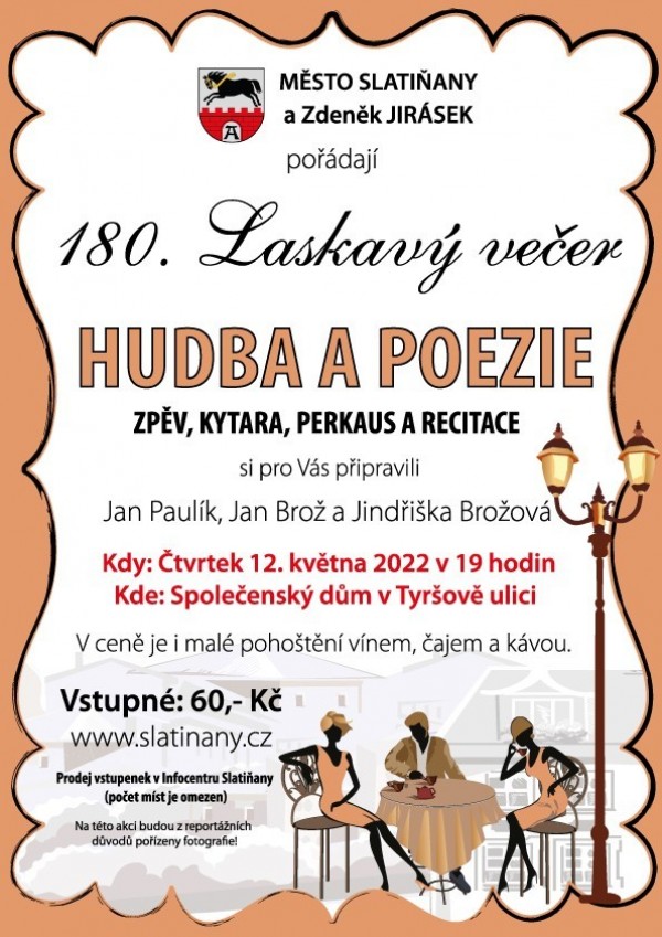 Srdečně zveme na 180. Laskavý večer do Společenského domu 12. května od 19 hodin. Zpěv, kytara, perkaust a recitace pro Vás připravili Jan Paulík, Jan Brož a Jindřiška Brožová.