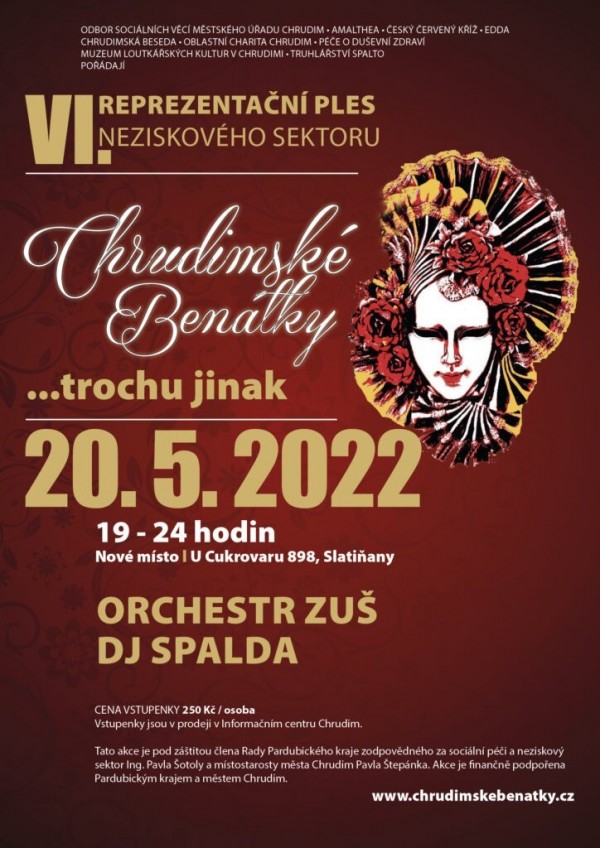 Do venkovních prostor přenášíme výzdobu v benátském stylu, k tanci zahraje, jak jsme již zvyklí, Taneční a dechový orchestr ZUŠ Chrudim a DJ Spalda. Plesem nás provede moderátor Martin Dytrt. Připraven bude i fotokoutek, bohatá tombola a samozřejmě doprovodný program s překvapením o půlnoci.